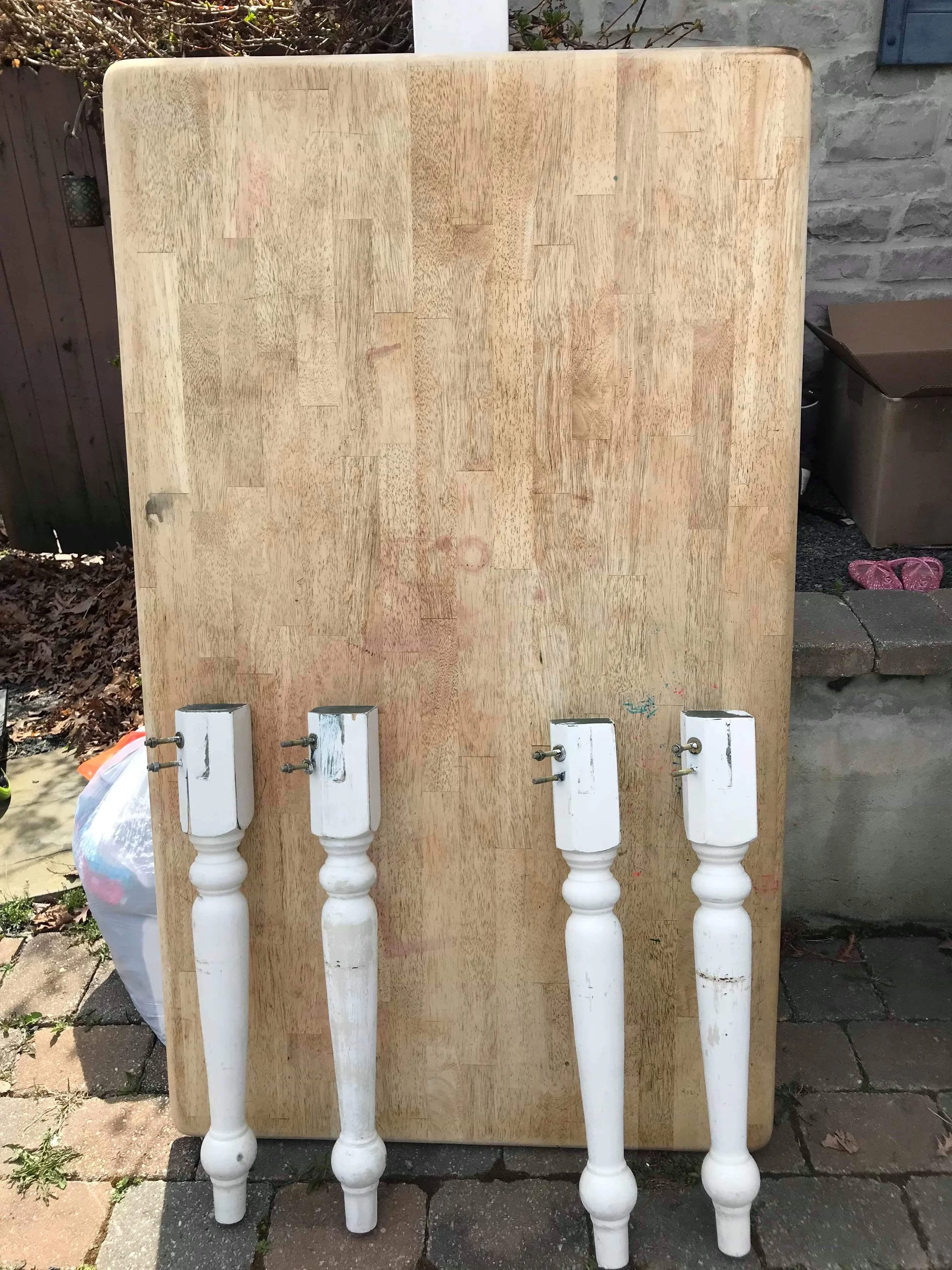 As I often do, I turned to Facebook Marketplace to see if I could find any type of butcher block surface on there. My search led me to a number of available butcher block style tables which sparked the idea of transforming a solid wood table into the desktop I had been dreaming up! I found the perfect sized table (60”x36” for my 56”x24” space) for only $20 in a neighboring town, so I contacted the seller, and picked it up the very next day!