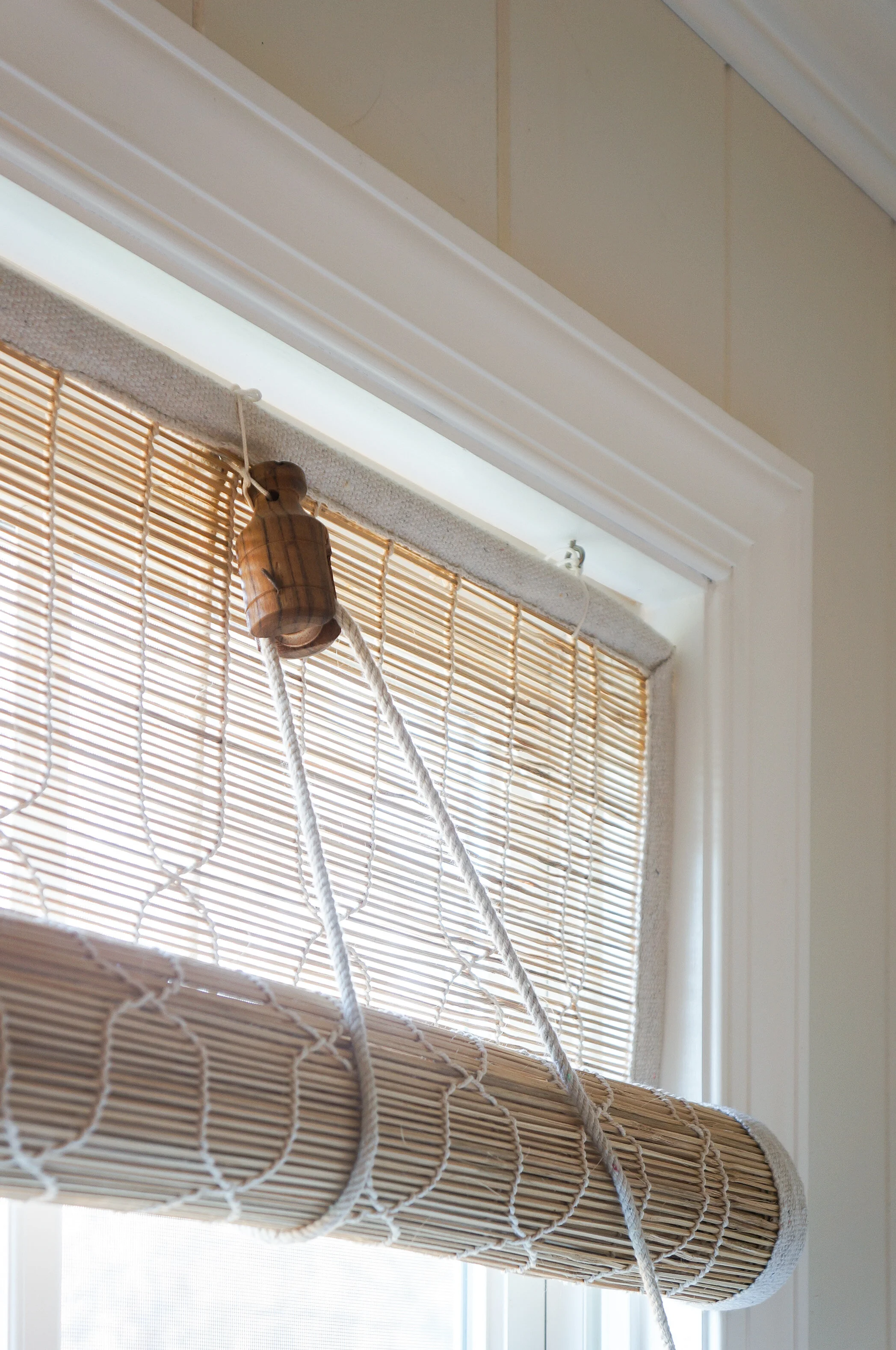 Lowering and raising them is done with the cute wooden pulley that they come with. The pulley may actually be my favorite part! To keep them raised they need to be tied off - that is where my little cup-hook tie back comes in.